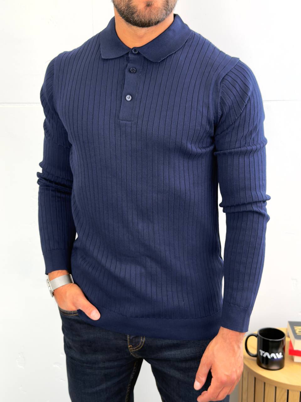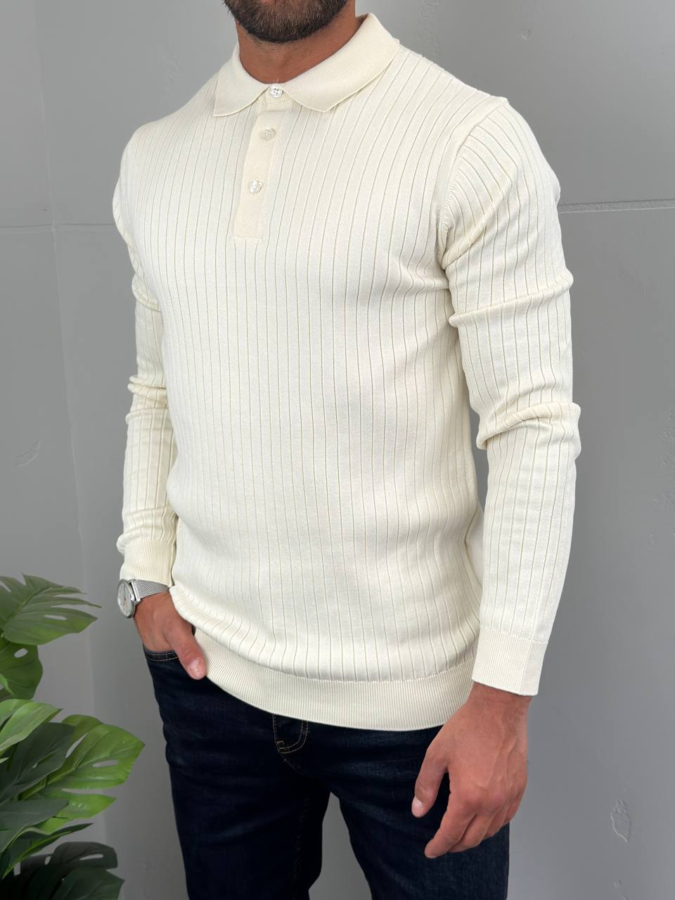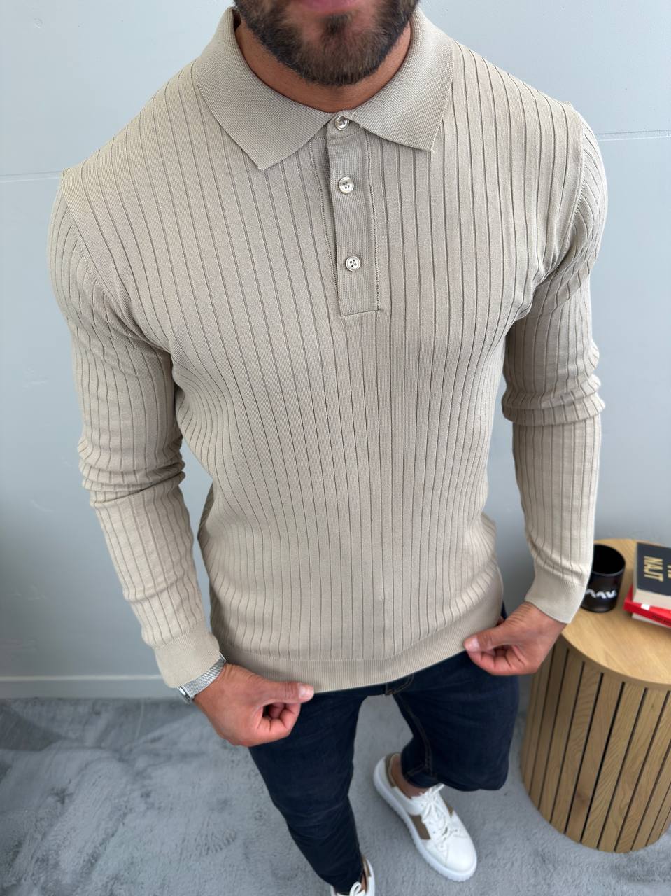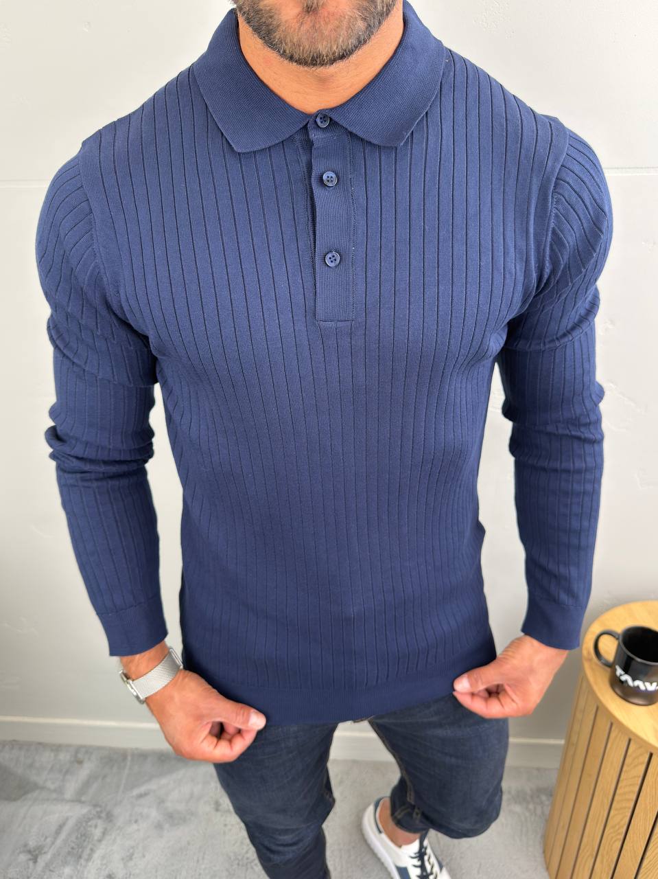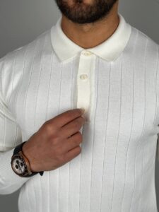 Dugi rukavi i polo kragna sa tri dugmeta za uredan, ali opušten stil