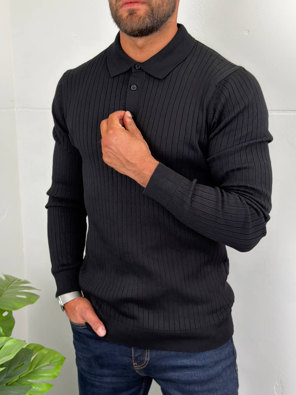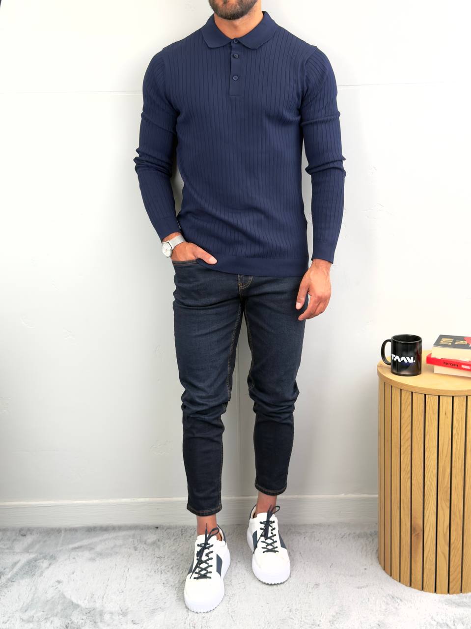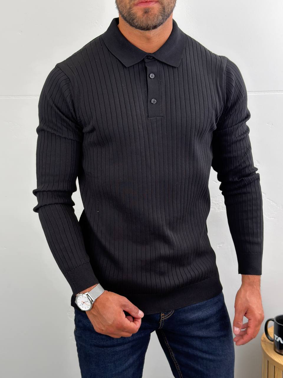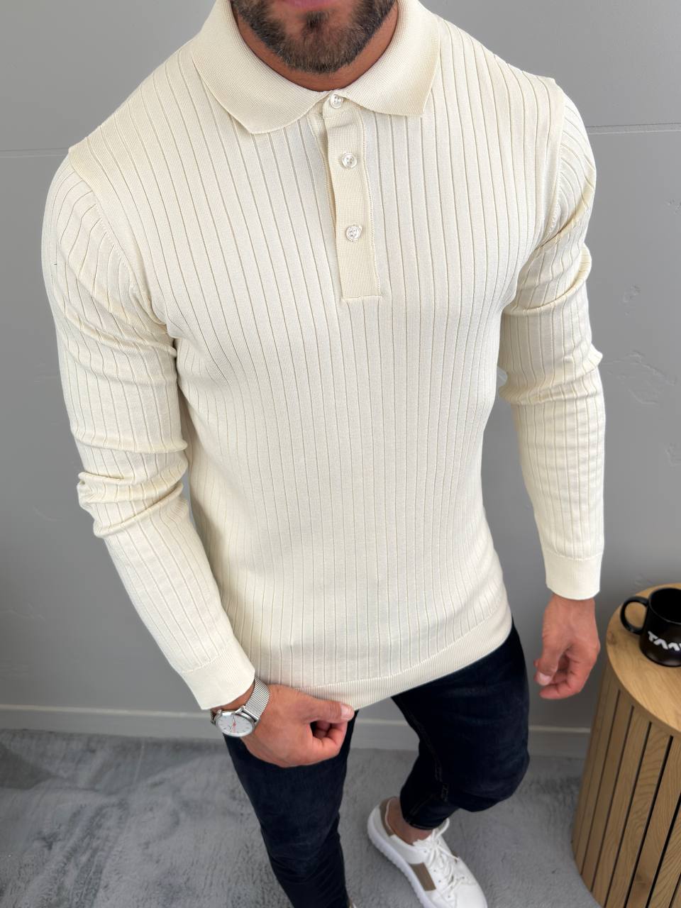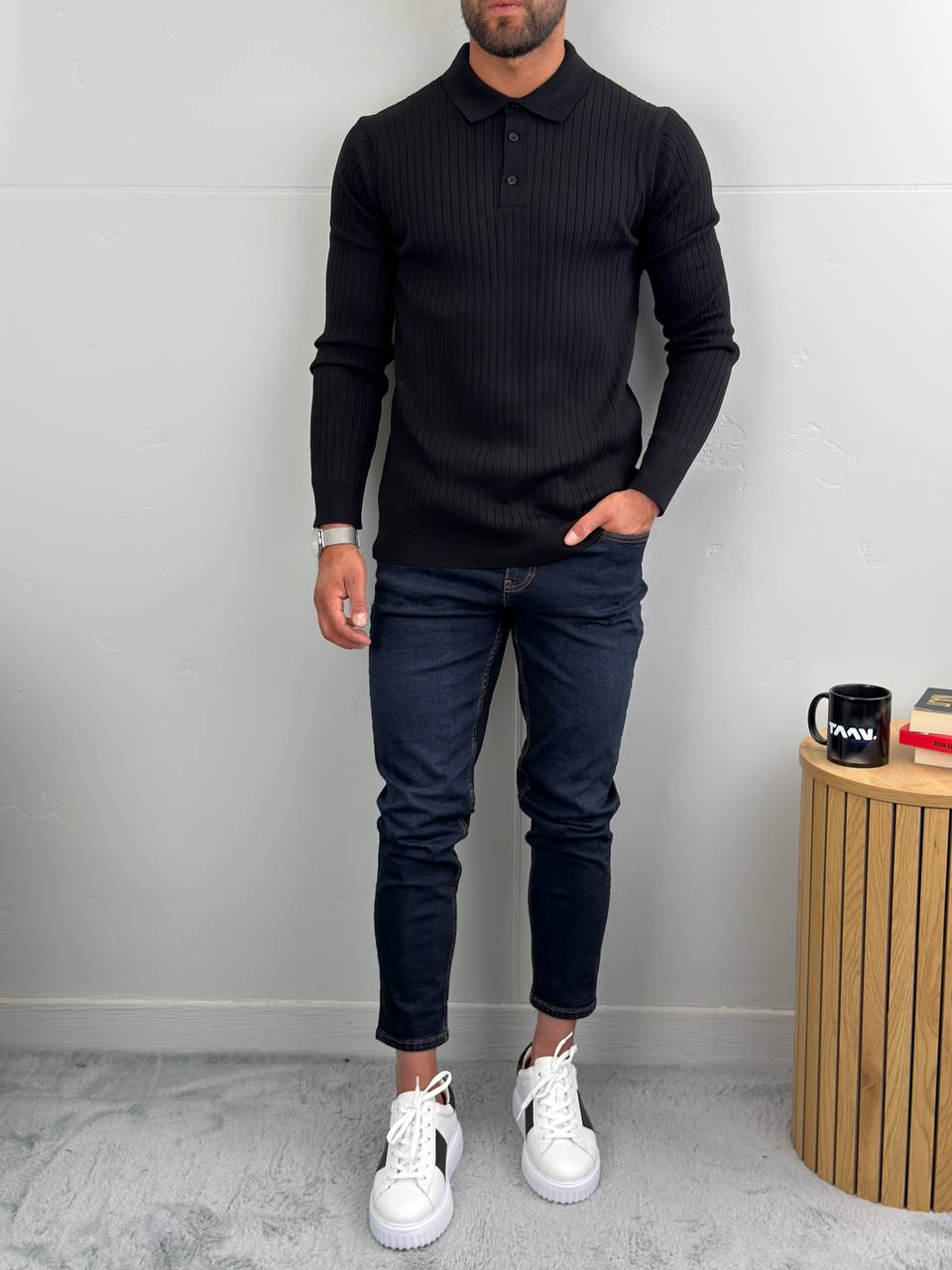 Dugi rukavi i polo kragna sa tri dugmeta za uredan, ali opušten stil