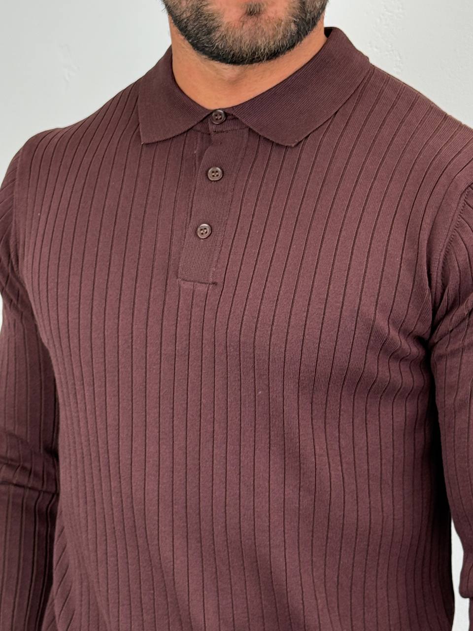Detalji: rebrasta tekstura, polo kragna, tri dugmeta