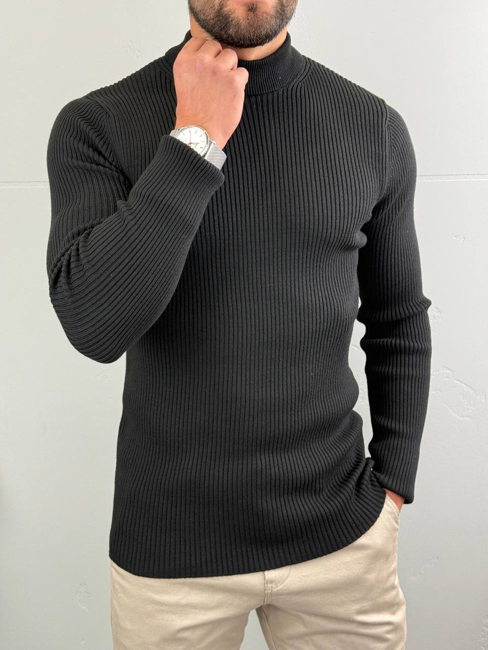 Rebrasta tekstura dodaje dubinu i eleganciju, dok visok okovratnik pruža dodatnu zaštitu od hladnoće.